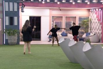 Finalistas do BBB 23, Aline Wirley, Amanda e Bruna Griphao conversam na área externa da casa mais ...