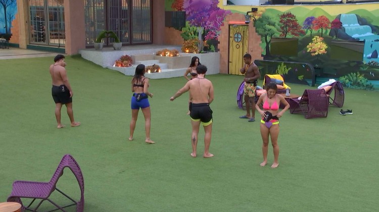 Alane e Beatriz, que estavam na piscina, correm para o gramado para dançarem.