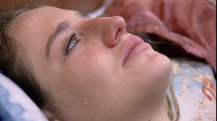 Após chorar sozinha no jardim, Bruna Griphao, que está emparedada, vai para o Quarto Deserto, deita na cama, segura a mão de Amanda e se emociona novamente.