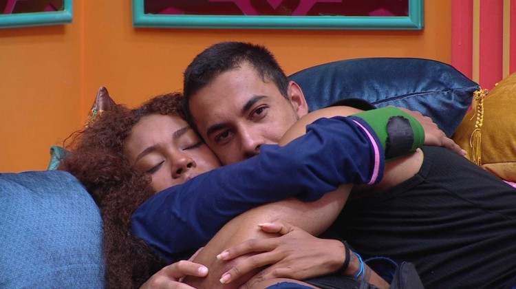 Na manhã de terça-feira (04), os participantes do 25 se reúnem na sala para fazer o Raio-X do dia. Maike e Giovanna deitam no sofá, abraçados. "Vou ficar grudado em você hoje", diz o paulista.